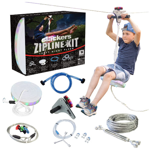 Equipped with over 40 motion-activated LED lights on the seat and trolley, this 100-foot kit extends the adventure into the evening by illuminating your backyard flight path.