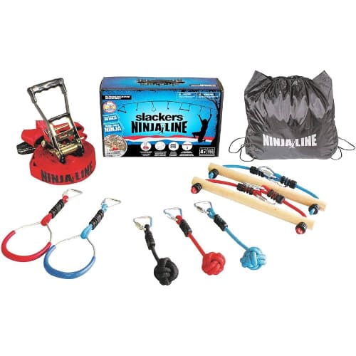 A Slackline is designed to be installed just a few feet off the ground for the purpose of balancing and walking across the webbing, whereas a Ninjaline is mounted higher up and features sewn-in pockets for hanging obstacles like rings and monkey bars. If your goal is to build an overhead obstacle course to improve upper-body strength, the Ninjaline is the correct choice.